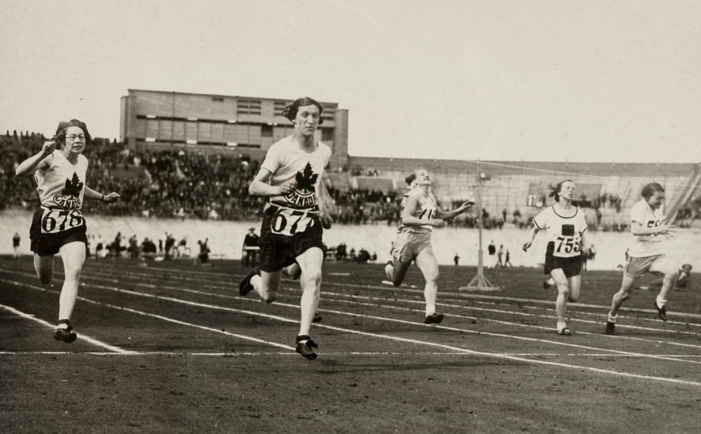 • Ethel Smith (left) and Bobbie Rosenfeld (second from left) of Canada, perhaps at semi-final in the women's100 meters at the 28th Summer Olympic Games in Amsterdam, Fanny Rosenfeld, Public domain via Wikimedia Commons