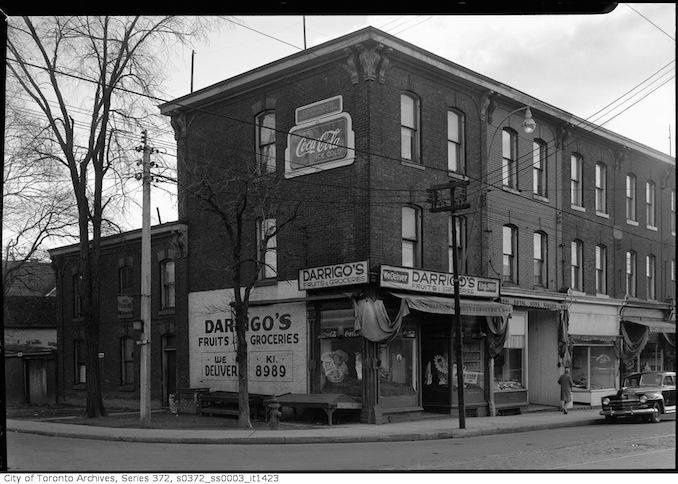 Photo: Corner Spruce and Carlton Streets (Darrigo's Grocery), Ca. 1947, City of Toronto Archives, Series 372