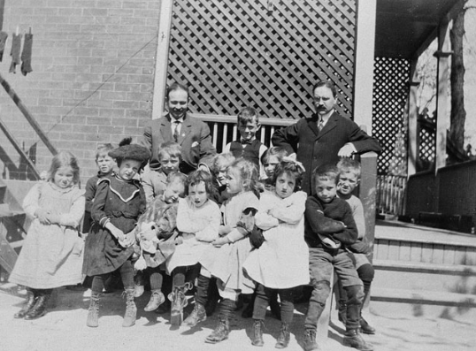 • On steps - Mr. J.J. Kelso, founder of the Children's Aid Society, with W.H. Wightmyer and some of the children. Belleville, Ontario, 1910, courtesy John Joseph Kelso / Library and Archives Canada / C-085882