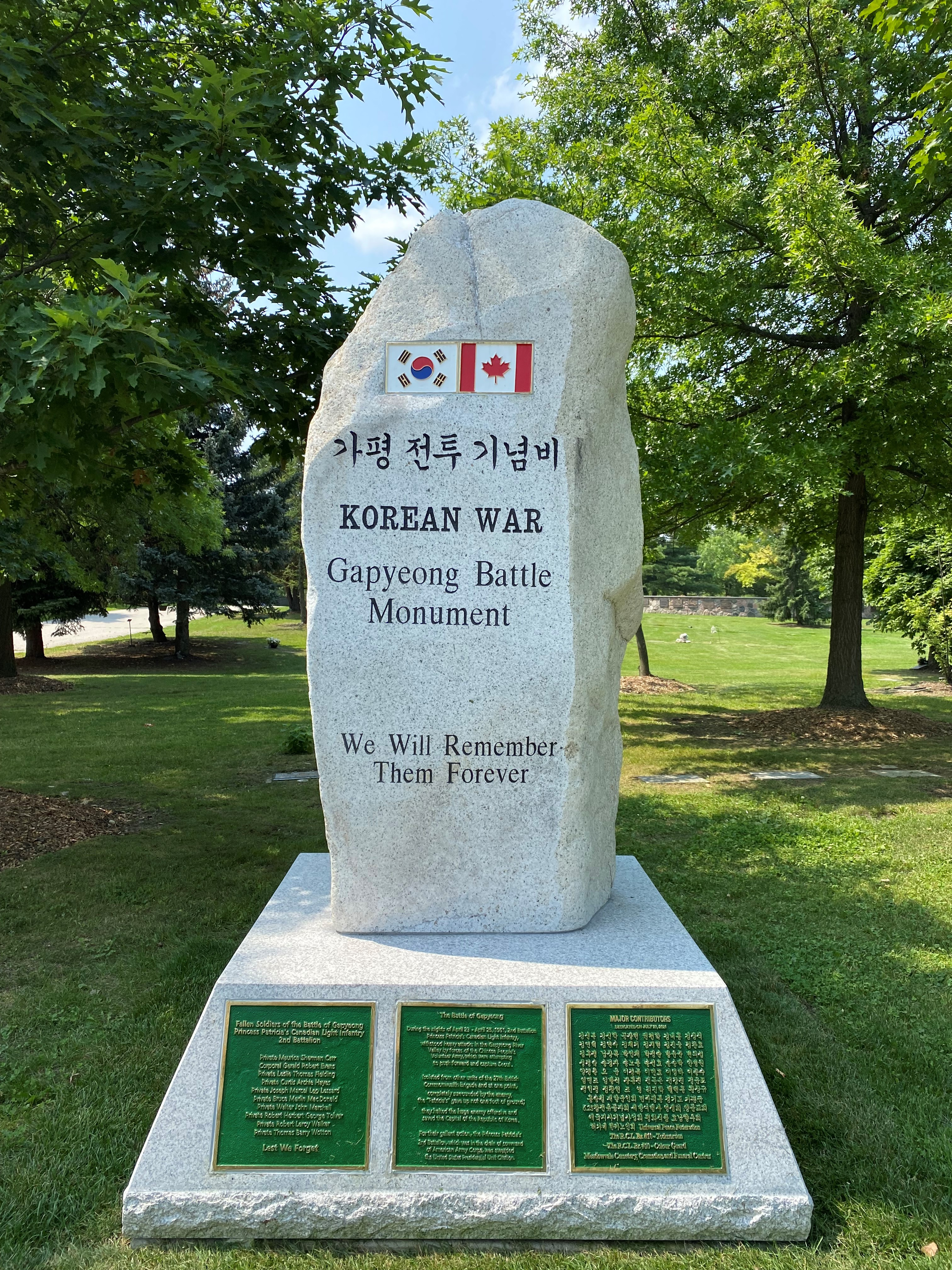 The monument anchors Meadowvale’s War Memorial and Veterans section, a space designed for reflection and remembrance of those who gave everything. It commemorates not only the bravery of those at Gapyeong, but also the broader Canadian contribution to the Korean War, where 26,791 Canadians served, with 516 killed and 1,255 wounded. Nearby, the Korean War National Wall of Remembrance, dedicated in 1997, lists every Canadian who fell during the conflict ensuring their sacrifice is never forgotten.